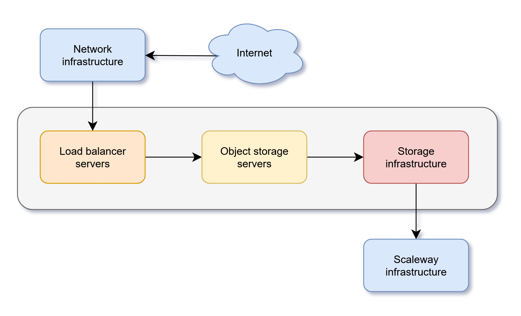 We realized that in addition to the load balancer and the storage servers, we needed quite a few internal services. We started requesting some in Scaleway’s common infrastructure.