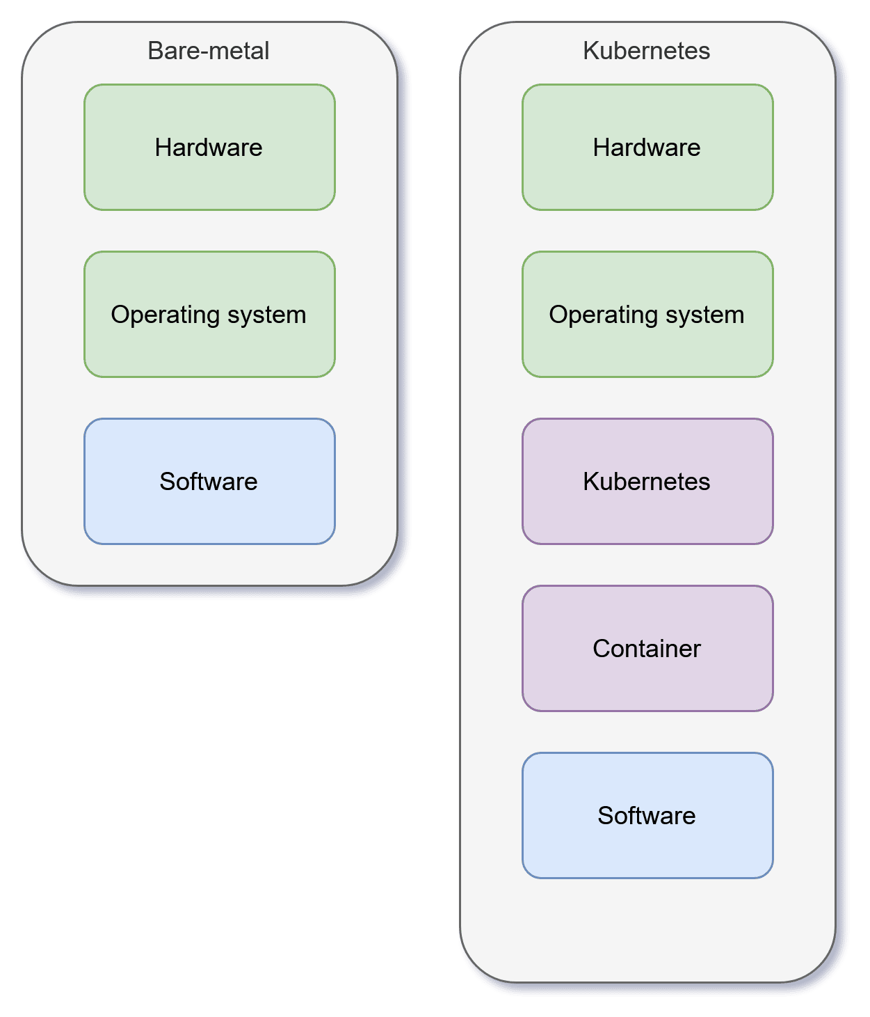 Using kubernetes adds two components to manage. The purple ones. At no extra benefit.