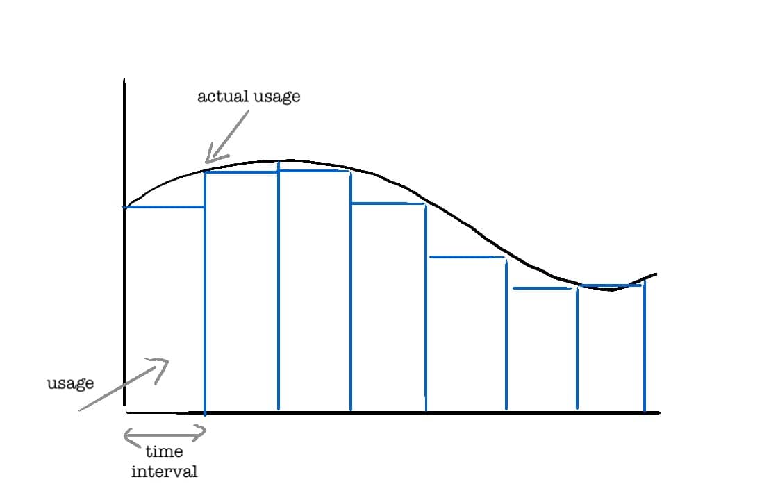 Segmentation of usage curve. You bill the surface under the usage curve. The smaller the intervals, the more precise you are, but the more compute and storage you need to bill.