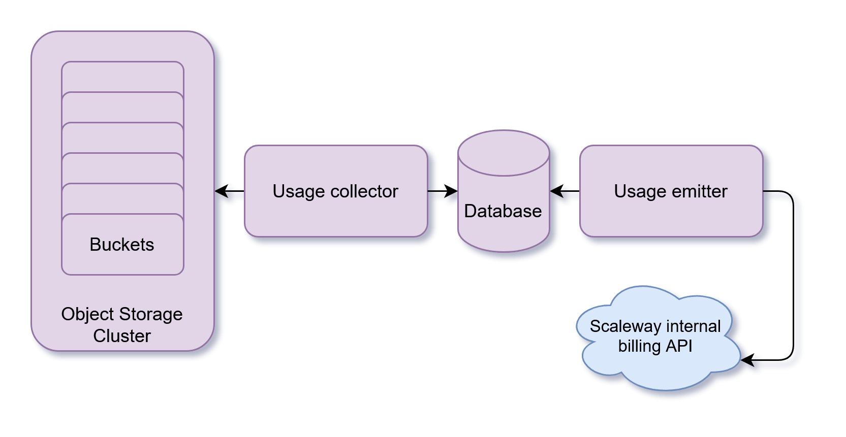Nevertheless, he and Alexandre (e) did the usage part. The system would poll the cluster at regular intervals and store the telemetry in a local database. This required querying the internal OpenIO API. Once the telemetry was collected in the database, we would emit it to the billing systems. Why did we do it this way? The data we collected was ephemeral. If we did not collect it we didn’t have it. We could not reconstruct it. By storing in an intermediary location, we decoupled the systems.